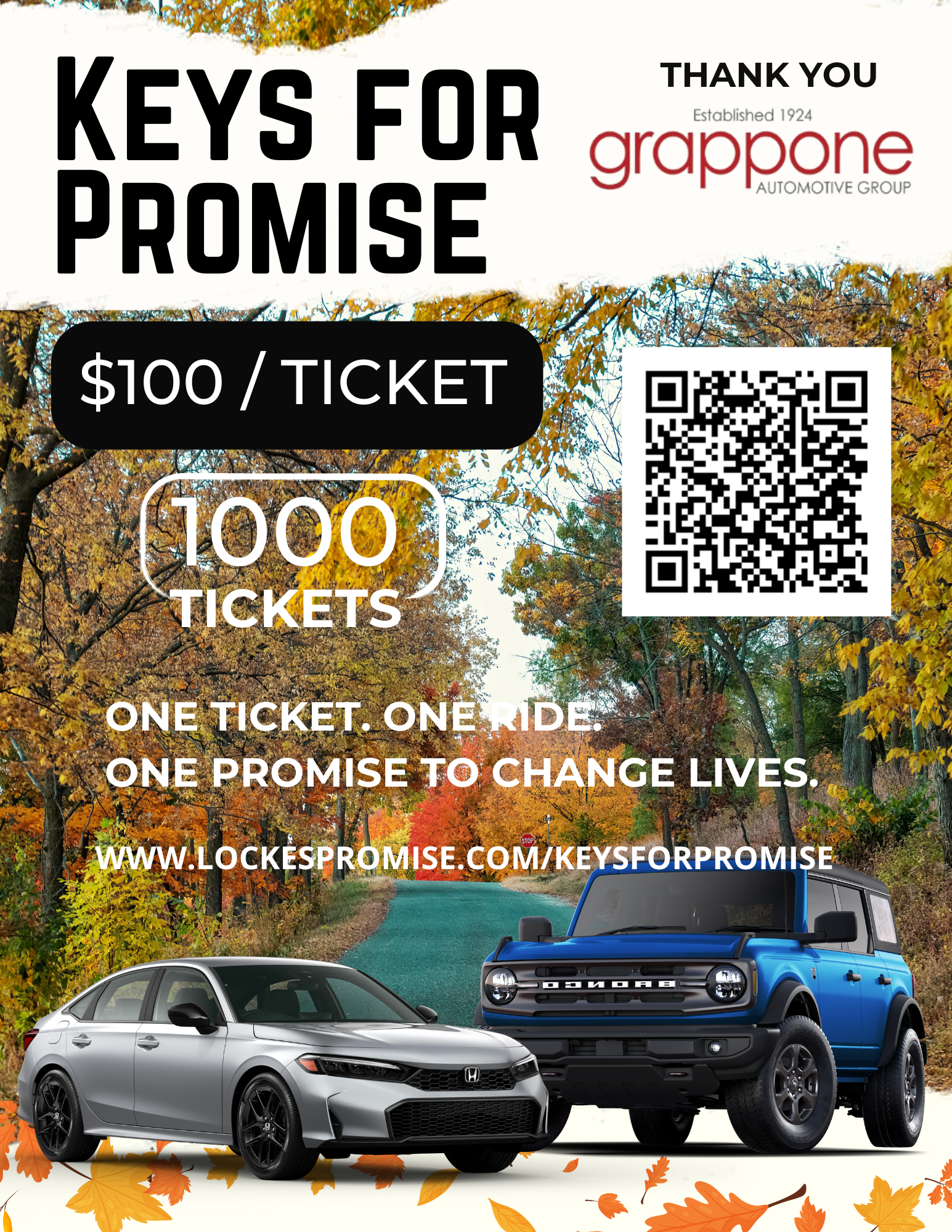 This October, Locke’s Promise is launching its most exciting fundraiser yet—the Keys For Promise raffle, where just 1,000 tickets are available at $100 each, giving participants incredible odds to win a new/used car or a cash prize while supporting a life-changing cause.
